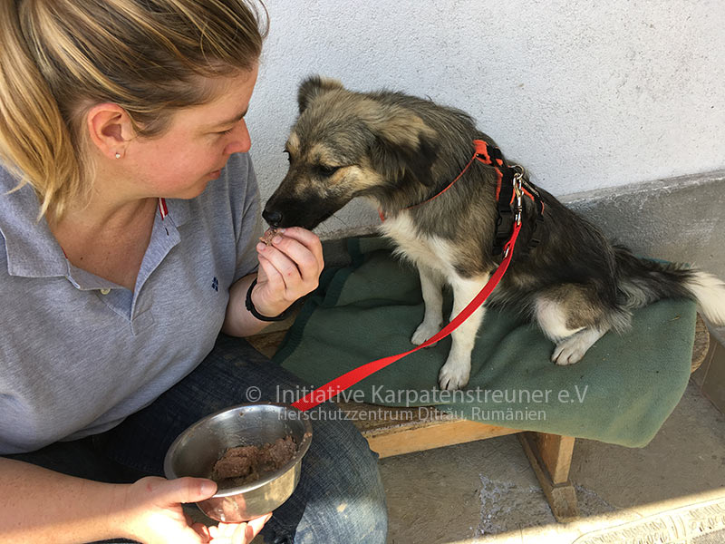 Gegen 16 Uhr werden die Zwinger erneut geöffnet, gereinigt, es gibt je nach Witterung neues Wasser und vor allem die Junghunde bekommen ein 2. Mal Futter. Kranke Hunde und Welpen werden versorgt, manche mit Medikamenten behandelt … bis es schließlich 8 Uhr am Abend ist. Dann kommen immer wieder neue Hunde an, die ihre Erstversorgung bekommen mit Entwurmung, Entflohung Impfungen …. einige sind verletzt, müssen nach Gheorgheni 20 km entfernt zum Tierarzt gefahren werden… Alles zusammen kein leichter Job und ein sehr einsamer. Menschen kommen höchstens, wenn sie einen Hund loswerden wollen.