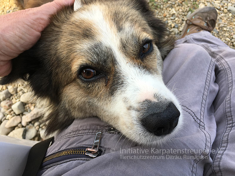 Die sehr aktive Tierschützerin Maria-Mirabela aus Toplitza hatte sich seit Januar diesen Jahres um die Hündin gekümmert, die mit einer kleinen Streunergruppe an einem Waldrand lebt. Werner und Agota sind am Samstag mit dem VW T4 dorthin gefahren, um einige Tiere zwecks Kastration einzusammeln und sind dabei auch auf diese Hündin gestoßen, die sich nur auf zweieinhalb Beinen vorwärts humpelnd bewegen kann. Wie sie in der Halbwildnis überleben konnte ist ein kleines Wunder. Wir wissen nicht, ob sie einen Unfall hatte, ob Mensche ihr das angetan haben, wir wissen nur, dass sie eines Tages da war. Sie ist freundlich geduldig und sehr lieb zu Menschen.