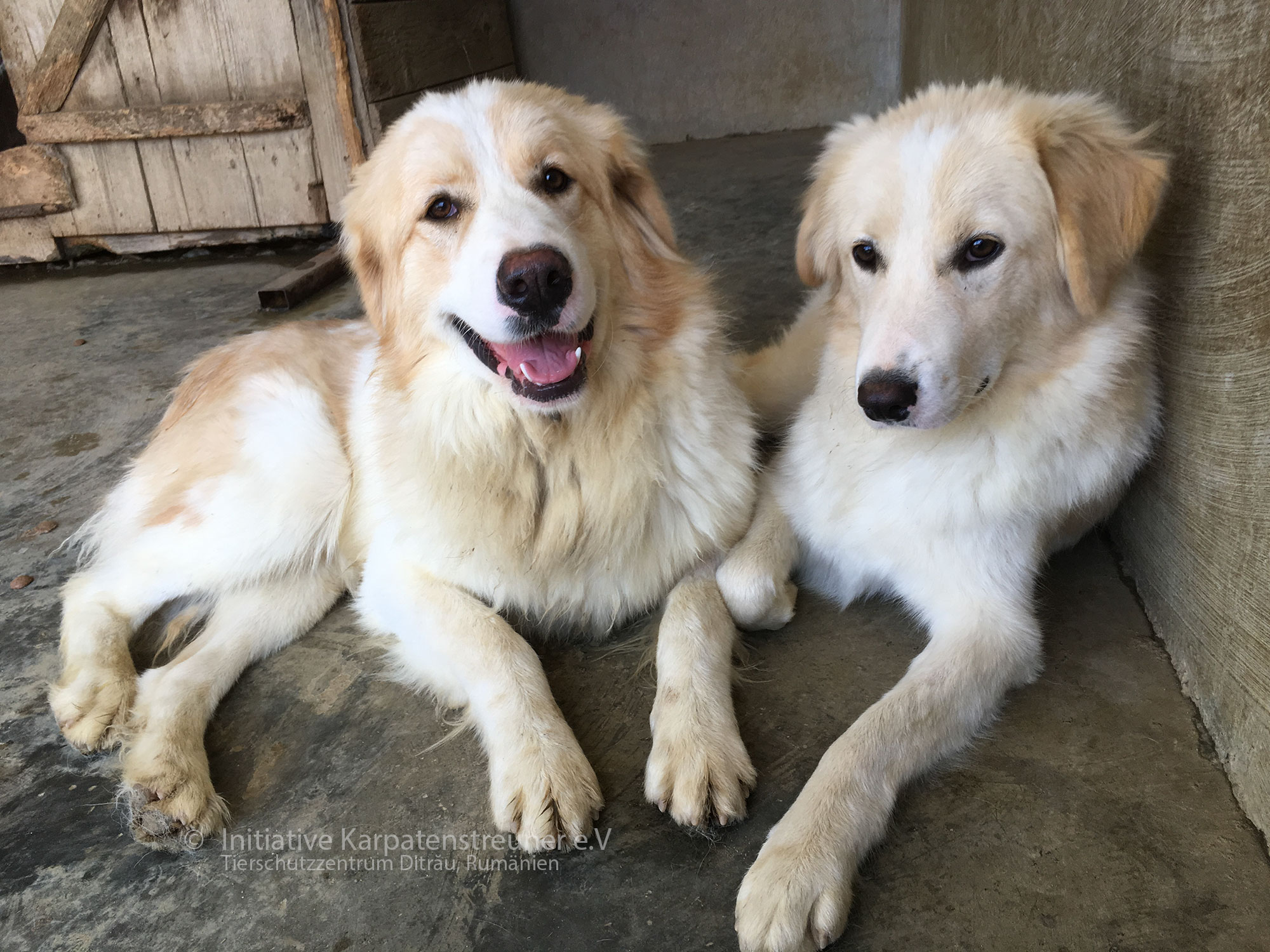 Amelys Kinder Akimo, Aladdin, Amy, Ariel und Ashley sind kräftig gewachsen und nun schon fast ein Jahr alt. Anders alt die Mutter sind sie nicht scheu vor Menschen. Distanziert neugierig kommen sie an, wuffeln ein wenig, um zu sagen, dass sie hier aufpassen, schnüffeln an der Hand, lassen sich an der Nase kraulen und ziehen wieder ihrer Wege. Es sind Herdenschutzhunde, wie sie hier in den Karpaten häufig zu finden sind. Meist sind sie ruhig und gelassen, mit Artgenossen kommen sie gut zurecht, meist spielen sie aber mit ihren eigenen Geschwistern. Man sieht sie eigentlich immer zusammen.